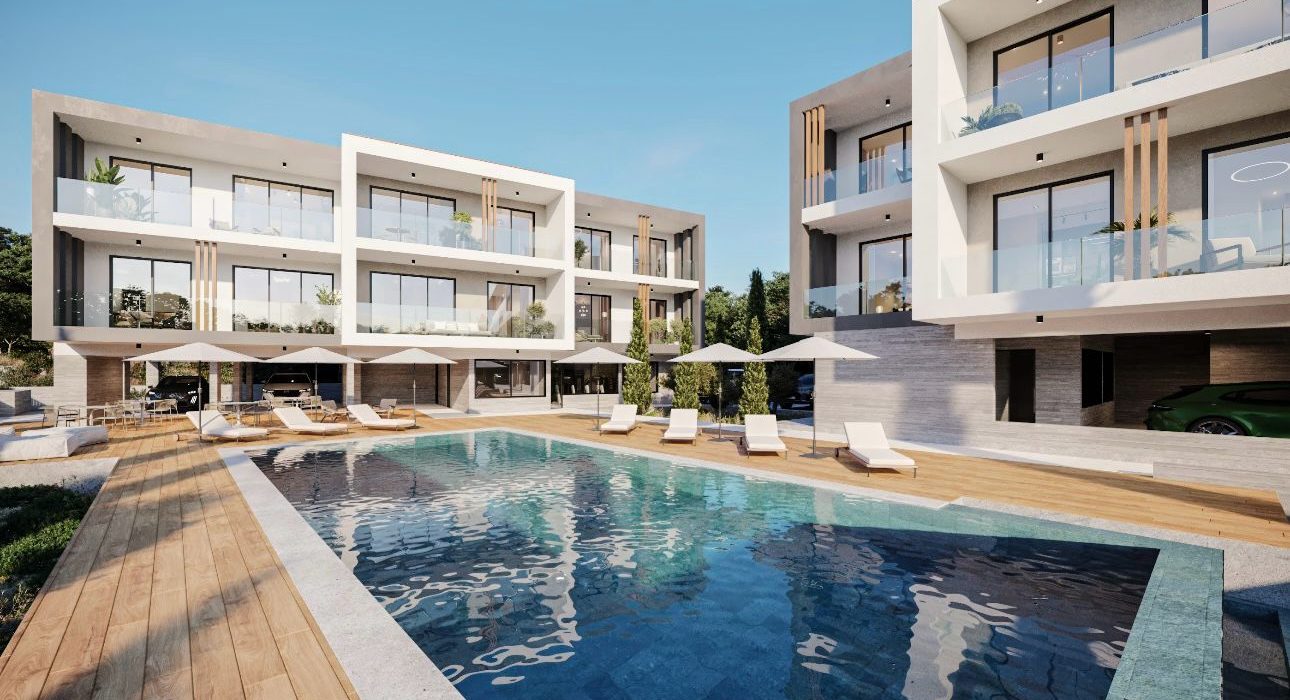 Cirvis (Chloraka, Pafos) – A gated condominium of 18 apartments (10×1BR, 8×2BR, 57–100 sqm) in lower Chloraka. Off-plan pricing starts at €220,000 for a 1BR (up to €360k for 2BR). Cirvis offers modern Mediterranean style with two pools, a covered BBQ area, landscaped gardens, sea views, and communal parking. Its location near the Tombs of the Kings combines seaside tranquility with short-term rental demand.